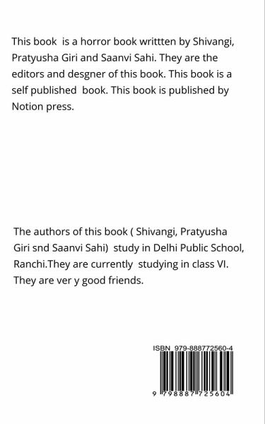 This book is a horror novel. This is about a boy who lives in London and loves to read novels. One day he goes to a market shop to buy a book and sees this book. He bought this book after buying it, his life was totally changed. As this novel is written by class 6 students, we would request you to try our book and give feedback.