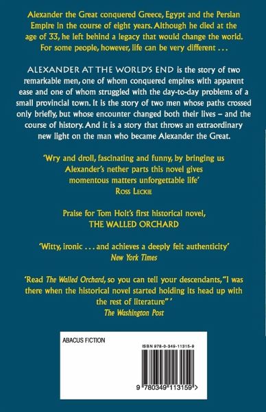 In ALEXANDER AT THE WORLD'S END, Tom Holt tells the story of two remarkable men, one of whom conquered empires and one of whom struggled to overcome the drainage problems of a small village. It is a story of two men whose paths crossed only briefly, but whose encounter changed both their lives for ever. And it is a story which throws an extraordinary new light on the man who became Alexander the Great.