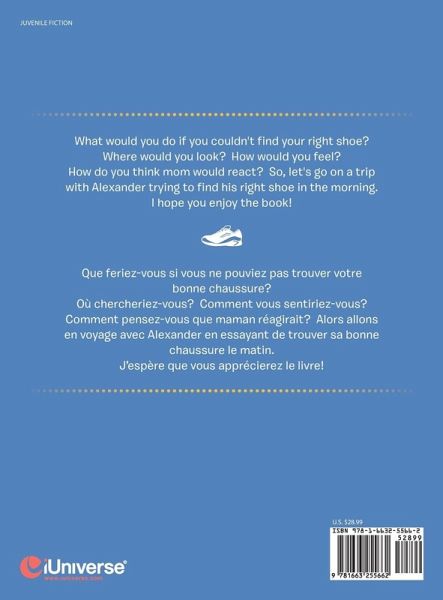 What would you do if you couldn't find your right shoe? Where would you look? How would you feel? How do you think mom would react? So, let's go on a trip with Alexander trying to find his right shoe in the morning. I hope you enjoy the book! Que feriez-vous si vous ne pouviez pas trouver votre bonne chaussure? Où chercheriez-vous? Comment vous sentiriez-vous? Comment pensez-vous que maman réagirait? Alors allons en voyage avec Alexander en essayant de trouver sa bonne chaussure le matin. J'espère que vous apprécierez le livre!