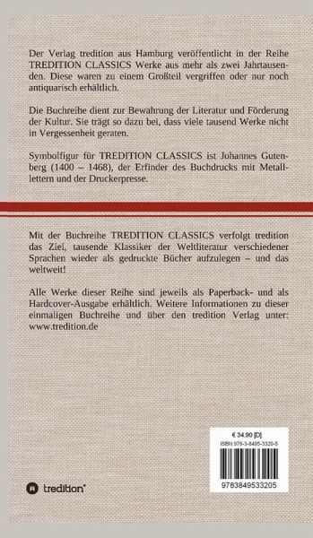 Diese Hardcover-Ausgabe ist Teil der TREDITION CLASSICS. Der Verlag tredition aus Hamburg veröffentlicht in der Buchreihe TREDITION CLASSICS Werke aus mehr als zwei Jahrtausenden. Diese waren zu einem Großteil vergriffen oder nur noch antiquarisch erhältlich. Mit TREDITION CLASSICS verfolgt tredition das Ziel, tausende Klassiker der Weltliteratur verschiedener Sprachen wieder als gedruckte Bücher zu verlegen und das weltweit! Die Buchreihe dient zur Bewahrung der Literatur und Förderung der Kultur. Sie trägt so dazu bei, dass viele tausend Werke nicht in Vergessenheit geraten.