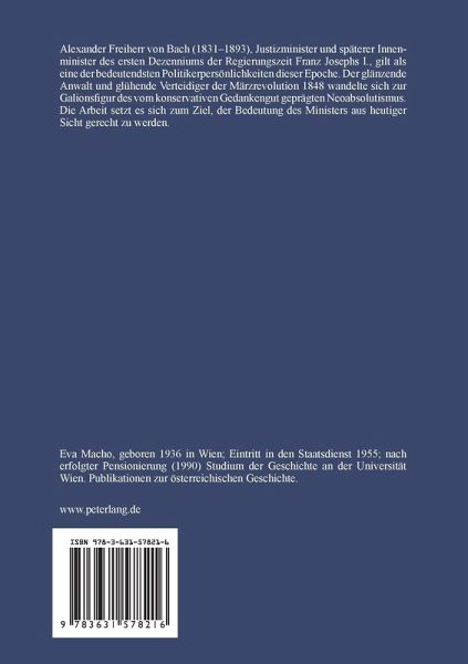 Alexander Freiherr von Bach (1813-1893), Justizminister und späterer Innenminister des ersten Dezenniums der Regierungszeit Franz Josephs I., gilt als eine der bedeutendsten Politikerpersönlichkeiten dieser Epoche. Der glänzende Anwalt und glühende Verteidiger der Märzrevolution 1848 wandelte sich zur Galionsfigur des vom konservativen Gedankengut geprägten Neoabsolutismus. Die Arbeit setzt es sich zum Ziel, der Bedeutung des Ministers aus heutiger Sicht gerecht zu werden.