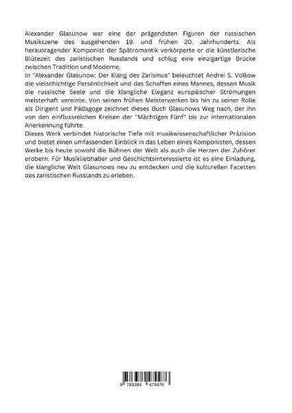 Alexander Glasunow war eine der prägendsten Figuren der russischen Musikszene des ausgehenden 19. und frühen 20. Jahrhunderts. Als herausragender Komponist der Spätromantik verkörperte er die künstlerische Blütezeit des zaristischen Russlands und schlug eine einzigartige Brücke zwischen Tradition und Moderne.In "Alexander Glasunow: Der Klang des Zarismus" beleuchtet Andrei S. Volkow die viel-schichtige Persönlichkeit und das Schaffen eines Mannes, dessen Musik die russische Seele und die klangliche Eleganz europäischer Strömungen meisterhaft vereinte. Von seinen frühen Meisterwerken bis hin zu seiner Rolle als Dirigent und Pädagoge zeichnet dieses Buch Glasunows Weg nach, der ihn von den einflussreichen Kreisen der "Mächtigen Fünf" bis zur internationalen Anerkennung führte.Dieses Werk verbindet historische Tiefe mit musikwissenschaftlicher Präzision und bietet einen umfassenden Einblick in das Leben eines Komponisten, dessen Werke bis heute sowohl die Bühnen der Welt als auch die Herzen der Zuhörer erobern. Für Musikliebhaber und Geschichtsinteressierte ist es eine Einladung, die klangliche Welt Glasunows neu zu entdecken und die kulturellen Facetten des zaristischen Russlands zu erleben.