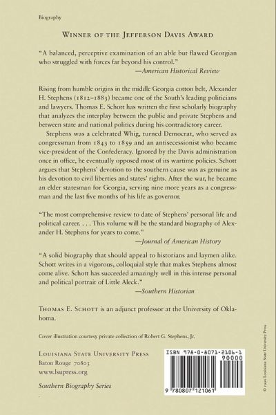 Alexander H. Stephens was a celebrated Whig turned Democrat who served as congressman from 1843 to 1859, and an antisecessionist who became vice-president of the Confederacy. This biography analyzes the interplay between the public and private Stephens and between state and national politics.