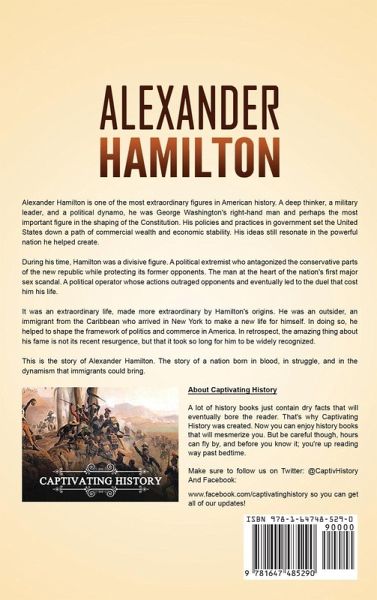 Explore the Fascinating Life of Alexander Hamilton! Alexander Hamilton is one of the most extraordinary figures in American history. A deep thinker, a military leader, and a political dynamo, he was George Washington's right-hand man and perhaps the most important figure in the shaping of the Constitution. His policies and practices in government set the United States down a path of commercial wealth and economic stability. His ideas still resonate in the powerful nation he helped create. During his time, Hamilton was a divisive figure. A political extremist who antagonized the conservative parts of the new republic while protecting its former opponents. The man at the heart of the nation's first major sex scandal. A political operator whose actions outraged opponents and eventually led to the duel that cost him his life. It was an extraordinary life, made more extraordinary by Hamilton's origins. He was an outsider, an immigrant from the Caribbean who arrived in New York to make a new life for himself. In doing so, he helped to shape the framework of politics and commerce in America. In retrospect, the amazing thing about his fame is not its recent resurgence, but that it took so long for him to be widely recognized. This book tells the story of Alexander Hamilton. The story of a nation born in blood, in struggle, and in the dynamism that immigrants could bring. This Book Includes Captivating Stories and Facts about Alexander Hamilton's: Caribbean Childhood Education and Quest for Finding Work Military Career First Steps in Politics Part in the 1796 Election Campaign Time in Public Office Life After the Treasury Affair with Maria Reynolds Legacy Furthermore, Alexander Hamilton also played a big role in: The Constitutional Convention Creating the Federalist Papers The Formation of a National Bank The Creation of Parties And a Great Deal More that You don't Want to Miss out on! Get the book to learn more about Alexander Hamilton's extraordinary life and memorable achievments