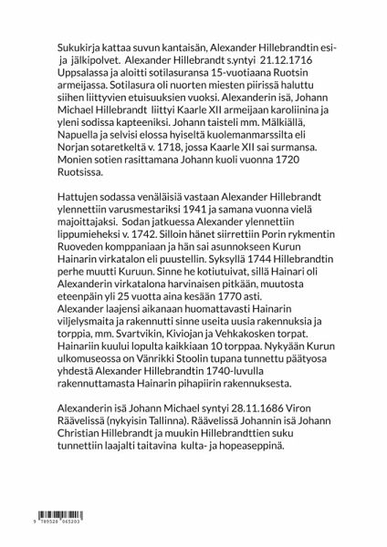 Alexander Hillebrandt s. 21.12.1716 Uppsalassa aloitti sotilasuransa 15-vuotiaana Ruotsin armeijassa. Hänen isänsä Johann Michael Hillebrandt liittyi KaarleXII armeijaan karoliinina ja yleni lopulta sodissa kapteeniksi. Johann taisteli mm. Mälkiällä, Napuella ja selvisi elossa hyiseltä kuolemanmarssilta eli Norjan sotaretkeltä 1718, jossa Kaarle XII sai surmansa. Monien sotien rasittamana Johann kuoli vuonna 1720 Ruotsissa. Hattujen sodassa venäläisiä vastaan Alexander Hillebrandt ylennettiin varusmestariksi 1941 ja samana vuonna vielä majoittajaksi. Sodan jatkuessa Alexander ylennettiin lippumieheksi v. 1742. Silloin hänet siirrettiin Porin rykmentin Ruoveden komppaniaan ja hän sai asunnokseen Kurun Hainarin virkatalon eli puustellin. Syksyllä 1744 Hillebrandtin perhe muutti Kuruun. Sinne he kotiutuivat, sillä Hainari oli Alexanderin virkatalona harvinaisen pitkään, muutosta eteenpäin yli 25 vuotta aina kesään 1770 asti. Alexander laajensi aikanaan huomattavasti Hainarin viljelysmaita ja rakennutti sinne useita uusia rakennuksia ja torppia, mm. Svartvikin, Kiviojan ja Vehkakosken torpat. Hainariin kuului lopulta kaikkiaan 10 torppaa. Nykyään Kurun ulkomuseossa on Vänrikki Stoolin tupana tunnettu päätyosa yhdestä Alexander Hillebrandtin 1740-luvulla rakennuttamasta Hainarin pihapiirin rakennuksesta. Alexanderin isä Johann Michael syntyi 28.11.1686 Viron Räävelissä (nykyisin Tallinna). Räävelissä Johannin isä Johann Christian Hillebrandt ja muukin suku tunnettiin pääsasiassa kulta- ja hopeaseppinä, mikä perinne jatkui suvussa pitkälle 1800-luvulle.