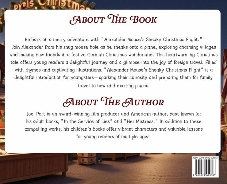 Embark on a merry adventure with "Alexander Mouse's Sneaky Christmas Flight." Follow Alexander from his snug mouse hole to a festive Christmas land in Germany with a magical map and big dreams. As Alexander Mouse sneaks onto a plane, discovers charming villages, and makes new friends, young readers will enjoy a heartwarming Christmas tale and a glimpse into the joy of travel to a foreign country. This delightful children's book, filled with rhymes and enchanting illustrations, serves as a beautiful introduction for children, sparking their curiosity and helping them prepare for family travel to new places.