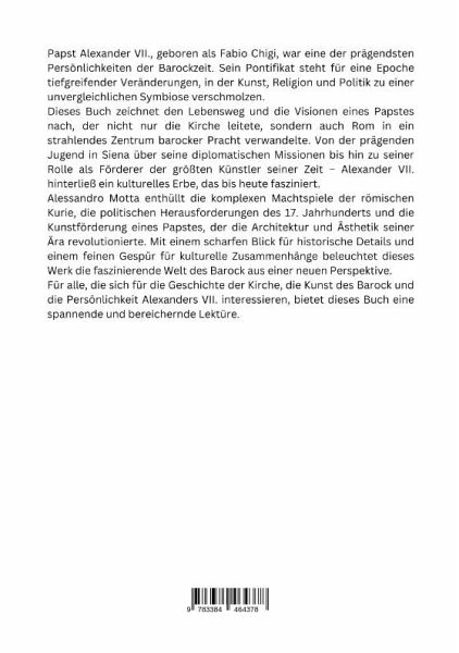 Papst Alexander VII., geboren als Fabio Chigi, war eine der prägendsten Persönlichkeiten der Barockzeit. Sein Pontifikat steht für eine Epoche tiefgreifender Veränderungen, in der Kunst, Religion und Politik zu einer unvergleichlichen Symbiose verschmolzen.Dieses Buch zeichnet den Lebensweg und die Visionen eines Papstes nach, der nicht nur die Kirche leitete, sondern auch Rom in ein strahlendes Zentrum barocker Pracht verwandelte. Von der prägenden Jugend in Siena über seine diplomatischen Missionen bis hin zu seiner Rolle als Förderer der größten Künstler seiner Zeit - Alexander VII. hinterließ ein kulturelles Erbe, das bis heute fasziniert.Alessandro Motta enthüllt die komplexen Machtspiele der römischen Kurie, die politischen Herausforderungen des 17. Jahrhunderts und die Kunstförderung eines Papstes, der die Architektur und Ästhetik seiner Ära revolutionierte. Mit einem scharfen Blick für historische Details und einem feinen Gespür für kulturelle Zusammenhänge beleuchtet dieses Werk die faszinierende Welt des Barock aus einer neuen Perspektive.Für alle, die sich für die Geschichte der Kirche, die Kunst des Barock und die Persönlichkeit Alexanders VII. interessieren, bietet dieses Buch eine spannende und bereichernde Lektüre.