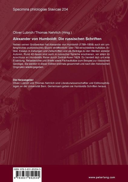 Neben seinen Großwerken hat Alexander von Humboldt (1769-1859) auch ein umfangreiches publizistisches uvre veröffentlicht: über 750 verschiedene Aufsätze, Artikel, Essays in Zeitungen und Zeitschriften und als Beiträge zu den Werken anderer Autoren. Rund 40 davon sind auch in russischer Sprache erschienen, vor allem im Anschluss an Humboldts Reise durch Zentral-Asien 1829. Es handelt sich um eine Erzählung, Reiseberichte und Briefe sowie Fachaufsätze zum Beispiel zur russischen Geologie. Sie werden in dieser Edition erstmals gesammelt und nach den historischen Originalen wiedergegeben.