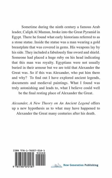 Sometime during the ninth century a famous Arab leader, Caliph Al Mamun, broke into the Great Pyramid in Egypt. There he found what early historians referred to as a stone statue. Inside the statue was a man wearing a gold breastplate that was covered in gems. His weapons lay by his side. They included a fabulously fine sword and shield. Someone had placed a huge ruby on his head indicating that this man was royalty. Egyptians were not usually buried in their armour but we are told that Alexander the Great was. So if this was Alexander, who put him there and why? To find out I have explored ancient legends, documents and medieval paintings. What I found was truly astonishing and leads to, what I believe could well be the final resting place of Alexander the Great. Alexander, A New Theory on An Ancient Legend offers up a new hypothesis as to what may have happened to Alexander the Great many centuries after his death.