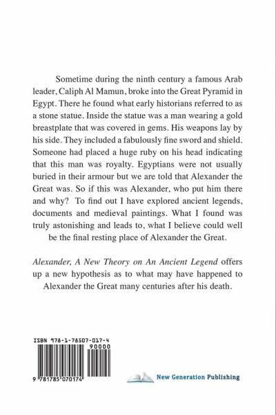 Sometime during the ninth century a famous Arab leader, Caliph Al Mamun, broke into the Great Pyramid in Egypt. There he found what early historians referred to as a stone statue. Inside the statue was a man wearing a gold breastplate that was covered in gems. His weapons lay by his side. They included a fabulously fine sword and shield. Someone had placed a huge ruby on his head indicating that this man was royalty. Egyptians were not usually buried in their armour but we are told that Alexander the Great was. So if this was Alexander, who put him there and why? To find out I have explored ancient legends, documents and medieval paintings. What I found was truly astonishing and leads to, what I believe could well be the final resting place of Alexander the Great. Alexander, A New Theory on An Ancient Legend offers up a new hypothesis as to what may have happened to Alexander the Great many centuries after his death.