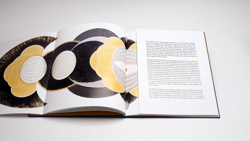 Die Kunst von Alexandra Tretter (_1988) ist ebenso tiefgründig wie verspielt. Verdankt sich ebenso der sanften Spiritualität der späten Geometrien Hilma af Klints wie den vor schierer Farblust überbordenden Scheiben-Bildern Sonia Delaunays. Ihr einfühlsam gestaltete Künstlerinnenbuch vereint monumentale Gemälde und intime Werke auf Papier, die durchdrungen sind von Tretters eigenen Lebenszusammenhängen als Künstlerin, als Frau, als Mutter.Es sind kaleidoskopische Figurationen, die sich aus einem in sich ruhenden Zentrum entfalten und in Symmetrie und Asymmetrie zu allen Seiten hin vervielfältigen. Der Kreisform, dem unveränderlichen Grundelement ihrer Kompositionen, stellt sie das permanent über sich hinausstrebende Oval entgegen, das sich in immer neuen Permutationen von einer Figur zur nächsten wandelt, zu Augen, Mündern, Brüsten, Blüten oder Vulven.Ihre Bilder ringen um Fassung, entfalten sich und blühen auf, um dann wieder jede Gestalthaftigkeit loszulassen. Einmal gefundene Stabilität wird sogleich in Aufruhr versetzt. Die Farben branden heftig auf oder fließen zart dahin, lichten oder verschatten sich, tragen einander oder werfen sich gegenseitig aus der Bahn. Materialisierung und Auflösung realisiert Tretter als gleichberechtigte Grundprinzipien ihrer Malerei.Womit das, was die Bilder aufnehmen, bewahren und freigeben, Erfahrung, Wachstum und langsames Reifen sind. Ihre Bilder sind "Zuneigungsfigurationen", in denen jedes Einzelne sich anderem zuwendet, daran zweifelt oder wächst, sich mitunter abwendet oder umso bewusster hingibt. Sie stellen alles in Frage, beginnen neu und finden doch wieder zu sich, ins Eigene zurück.