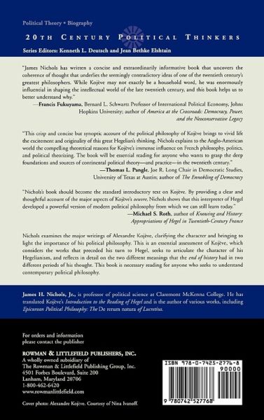 This crisp and concise but synoptic account of the political philosophy of Alexandre Kojeve brings to vivid life the excitement and originality of this great Hegelian's thinking. Nichols explains to the Anglo-American world the compelling theoretical reasons for Kojeve's immense influence on French philosophy, politics, and political theorizing. The book will be essential reading for anyone who wants to grasp the deep foundations and sources of continental political theory-and practice-in the twentieth century. -- Thomas L. Pangle, Joe R. Long Chair in Democratic Studies, University of Texas at Austin, and author of Ennobling of Democracy: The Challenge of t James Nichols has written a concise and extraordinarily informative book that uncovers the coherence of thought that underlies the seemingly contradictory ideas of one of the twentieth century's greatest philosophers. While Alexandre Kojeve may not exactly be a household word, he was enormously influential in shaping the intellectual world of the late 20th century, and this book helps us to better understand why. -- Francis Fukuyama, The Bernard L. Schwartz Professor of International Political Economy, Johns Hopkins University, and author of America at the Cro Nichols's book should become the standard introductory text on Alexandre Kojeve. By providing a clear and thoughtful account of the major aspects of Kojeve's oeuvre, Nichols shows that this interpreter of Hegel developed a powerful version of modern political philosophy from which we can still learn today. -- Michael S. Roth, author of Knowing and History: Appropriations of Hegel in 20th-century France It is James H. Nichols, Jr., who can be thanked for giving us the first (abridged) English translation of Kojeve's Introduction to the Reading of Hegel, a book that established Kojeve's well-deserved reputation in France as one of the most original and influential thinkers of the twentieth century... Nichols' is precisely the sort of book that one should keep by one's side... Nichols has provided us with a concise but comprehensive introduction to one of the most intriguing philosophers of the twentieth century. Society