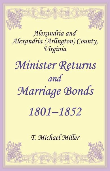 "Formally established as a town in 1749, Alexandria, Virginia grew from a small tobacco trading post into the economic, socio-political and ecclesiastical epicenter of Northern Virginia. Its population nearly doubled from 2,700 inhabitants in 1790 to 4,900 souls in 1800. Its harbor was filled with brigs, schooners and ships of the line which traversed the high seas and engaged in international and coastwise trade. The streets were lined with substantial brick houses and the 'sound of the hammer and trowel were at work every where...' In 1796, a visitor, the Duc de La Rouce Foucauld commented that: 'Alexandria is beyond all comparison the handsomest town in Virginia - indeed is among the finest in the United States.' "Besides its commercial and maritime importance, Alexandria was a center of early church activity. Scottish merchants and factors brought with them the Presbyterian faith and a meeting house was erected on South Fairfax street in 1772. The Protestant Episcopal Church functioned as the official state church of Virginia until it was disestablished in 1784. As early as the mid-1760's the Episcopalians had erected a 'Chapel of Ease' near Princess and Royal streets. The early church then fell into a state of disrepair and James Parsons and John Carlyle were hired by the vestry to construct a substantial new one at the head of Cameron street. Finished in 1773, Christ Church continues to serve the parish and the Alexandria community." This book contains a transcribed list of Minister Returns (1801-1853) and Marriage Bonds (1801-1852). Entries for both sections are arranged alphabetically by the groom's surname. Minister Return entries include the full names of groom and bride, the date and the minister who performed the ceremony. The Marriage Bond entries include the full names of the groom and bride, date, and full names of Bondsmen. A full-name index completes this work.