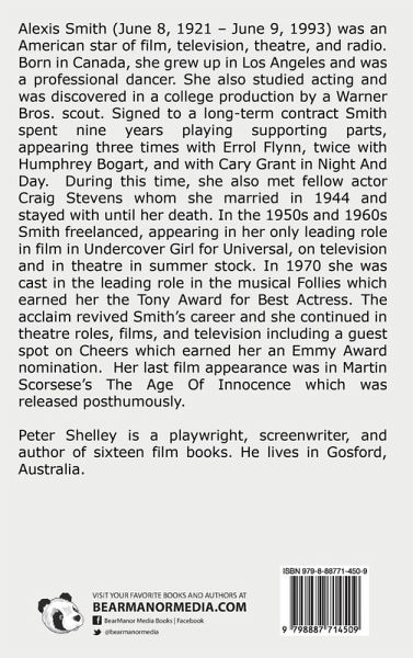 Alexis Smith (June 8, 1921 - June 9, 1993) was an American star of film, television, theatre, and radio. Born in Canada, she grew up in Los Angeles and was a professional dancer. She also studied acting and was discovered in a college production by a Warner Bros. scout. Signed to a long-term contract Smith spent nine years playing supporting parts, appearing three times with Errol Flynn, twice with Humphrey Bogart, and with Cary Grant in Night And Day. During this time, she also met fellow actor Craig Stevens whom she married in 1944 and stayed with until her death. In the 1950s and 1960s Smith freelanced, appearing in her only leading role in film in Undercover Girl for Universal, on television and in theatre in summer stock. In 1970 she was cast in the leading role in the musical Follies which earned her the Tony Award for Best Actress. The acclaim revived Smith's career and she continued in theatre roles, films, and television including a guest spot on Cheers which earned her an Emmy Award nomination. Her last film appearance was in Martin Scorsese's The Age Of Innocence which was released posthumously. Peter Shelley is a playwright, screenwriter, and author of sixteen film books. He lives in Gosford, Australia.