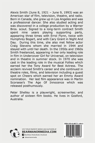 Alexis Smith (June 8, 1921 - June 9, 1993) was an American star of film, television, theatre, and radio. Born in Canada, she grew up in Los Angeles and was a professional dancer. She also studied acting and was discovered in a college production by a Warner Bros. scout. Signed to a long-term contract Smith spent nine years playing supporting parts, appearing three times with Errol Flynn, twice with Humphrey Bogart, and with Cary Grant in Night And Day. During this time, she also met fellow actor Craig Stevens whom she married in 1944 and stayed with until her death. In the 1950s and 1960s Smith freelanced, appearing in her only leading role in film in Undercover Girl for Universal, on television and in theatre in summer stock. In 1970 she was cast in the leading role in the musical Follies which earned her the Tony Award for Best Actress. The acclaim revived Smith's career and she continued in theatre roles, films, and television including a guest spot on Cheers which earned her an Emmy Award nomination. Her last film appearance was in Martin Scorsese's The Age Of Innocence which was released posthumously. Peter Shelley is a playwright, screenwriter, and author of sixteen film books. He lives in Gosford, Australia.