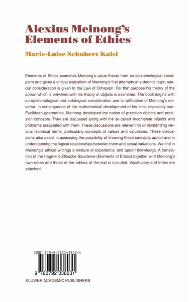 Elements of Ethics examines Meinong's value theory from an epistemological standpoint and gives a critical exposition of Meinong's first attempts at a deontic logic; special consideration is given to the Law of Omission. For that purpose his theory of the a priori is examined, which is entwined with his theory of objects. The book begins with an epistemological and ontological consideration and simplification of Meinong's universe. In consequence of the mathematical development of his time, especially non-Euclidean geometries, Meinong developed the notion of precision objects and precision concepts. They are discussed along with the so-called `incomplete objects' and problems associated with them. These discussions are relevant for understanding various technical terms, particularly concepts of values and valuations. These discussions also assist in assessing the possibility of knowing these concepts a priori, and in understanding the logical relationships between them and actual valuations. We find in Meinong's ethical writings a mixture of experiential and a priori knowledge. A translation is included of the fragment Ethische Bausteine (Elements of Ethics), together with Meinong's own notes and those of the editors of the text. Vocabulary and Index are attached.