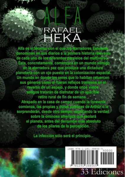 Alfa es el término con el que los Narradores Estelares denominan en sus diarios a la primera historia relevante de cada uno de los diferentes paralelos del multiverso. Ésta, concretamente, comenzará en un mundo sumido en la aterradora paz que produce una dictadura planetaria con un ojo puesto en la colonización espacial. Un mundo en donde los seres que lo habitan retuercen sus géneros como si fueran reflejos traviesos en el reverso de un espejo, y donde unos viejos amigos tratarán de disfrutar de un apacible retiro rural de fin de semana. Atrapado en la casa de campo cuando la tormenta comienza, las propias y duras palabras de Arthür¿o le sorprenderán, desde otro tiempo, explicando la verdad sobre la ominosa amenaza que asolará el planeta, antes del derrumbe más absoluto de los pilares de la percepción. La infección, sólo será el principio...
