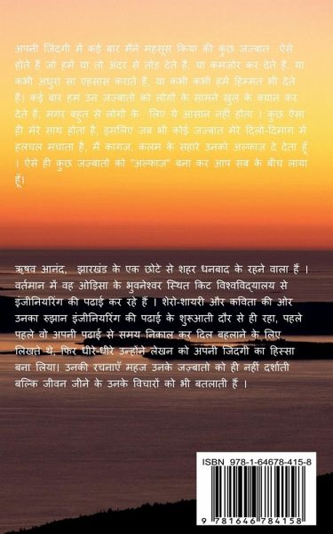 Many times I have felt that, some emotions are such that they break you , make you feel weak, sometimes make you feel incomplete, and sometimes they even give you a ray of hope. Some people easily express their emotions infront of people, while for some people, it is difficult to do so. My case was the later one, so whenever any kind of emotions affected me in any way, I used to put them down in words. "Alfaaz" is a collection of such poetries of mine.