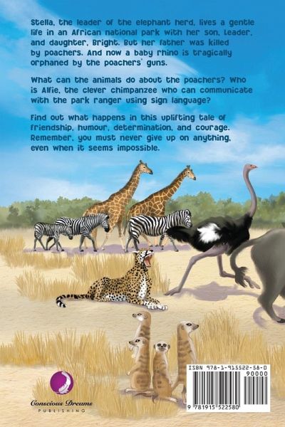 Stella, the leader of the elephant herd, lives a gentle life in an African national park with her son, Leader, and daughter, Bright. But her father was killed by poachers. And now a baby rhino is tragically orphaned by the poachers' guns. What can the animals do about the poachers? Who is Alfie, the clever and entertaining chimpanzee who can communicate with the park ranger using sign language? Find out what happens in this uplifting tale of friendship, humour, determination, and courage. Remember, you must never give up on anything, even when it seems impossible...