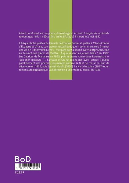 Alfred de Musset est un poète, dramaturge et écrivain français de la période romantique, né le 11 décembre 1810 à Paris, où il meurt le 2 mai 1857.Il fréquente les poètes du Cénacle de Charles Nodier et publie à 19 ans Contes d'Espagne et d'Italie, son premier recueil poétique. Il commence alors à mener une vie de « dandy débauché », marquée par sa liaison avec George Sand, tout en écrivant des pièces de théâtre : À quoi rêvent les jeunes filles ? en 1832, Les Caprices de Marianne en 1833, puis le drame romantique Lorenzaccio -- son chef-d'oeuvre --, Fantasio et On ne badine pas avec l'amour. Il publie parallèlement des poèmes tourmentés comme la Nuit de mai et la Nuit de décembre en 1835, puis La Nuit d'août (1836), La Nuit d'octobre (1837) et un roman autobiographique, La Confession d'un enfant du siècle, en 1836.