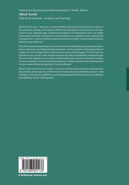 This self-contained book focuses on Tarski's early contributions to geometry and mathematics education, including the famous Banach-Tarski paradoxical decomposition of a sphere as well as high-school mathematical topics and pedagogy. These themes are significant since Tarski's later research on geometry and its foundations stemmed in part from his early employment as a high-school mathematics teacher and teacher-trainer. The book contains careful translations and much newly uncovered social background of these works written during Tarski's years in Poland.
