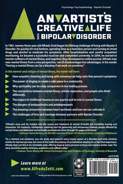 More than a just a journey, Alfredo gives us a blueprint for humane treatment of mental illness In 1981, twenty-three-year old Alfredo Zotti began his lifelong challenge of living with Bipolar II Disorder. He quickly hit rock bottom, spending time as a homeless person and turning to street drugs and alcohol to medicate his symptoms. After hospitalization and careful outpatient monitoring, he became a successful musician and completed university. In 2004, he started to mentor sufferers of mental illness, and together, they developed an online journal. Alfredo now sees mental illness from a new perspective, not of disadvantages but advantages. In his words: "Having a mental illness can be a blessing if we work on ourselves." In this memoir and critique of mental illness, the reader will learn: How empathic listening and being with someone can help calm that person's symptoms The power of singing to create a safe space in a community Why spirituality can be a key component in the healing process The connections between mental illness, artistic expression, and people who think differently The impact of childhood trauma on our psyche and its role in mental illness The dangers of antipsychotics and antidepressants The amazing connection between heart and brain and how we can cultivate it The challenges of love and marriage between partners with Bipolar Disorder "Alfredo's story and his insights into the causes and treatment of mental ill-health are incredibly moving and impressive. His humanity, intelligence, creativity and his generosity and compassion towards people affected by mental illness and dedicated mental health professionals shine through the pages of his book." -- Professor Patrick McGorry, AO MD PhD, Executive Director, OYH Research Centre, University of Melbourne "As a clinician and academic, one can study and research ever known aspect of a disorder and write scholarly articles for learned journals, but none of this holds the potency of an individual relaying his or her lived experience. Alfredo does just this in his inimitable style, offering hope at every juncture to those who travel a similar road. The story should be read by clinicians, academics and sufferers alike." --Professor Trevor Waring AM, Clinical Psychologist, Con-Joint Professor of Psychology, University of Newcastle Learn more at www.AlfredoZotti.com From the World Voices Series at Modern History Press www.ModernHistoryPress.com