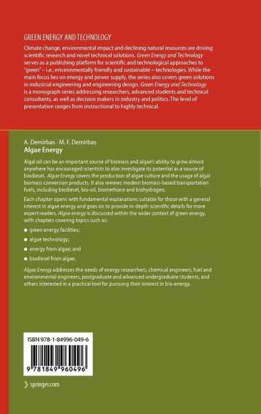 Each chapter opens with fundamental explanations suitable for those with a general interest in algae energy and goes on to provide in-depth scientific details for more expert readers. Algae energy is discussed within the wider context of green energy, with chapters covering topics such as: green energy facilities, algae technology, energy from algae and biodiesel from algae.