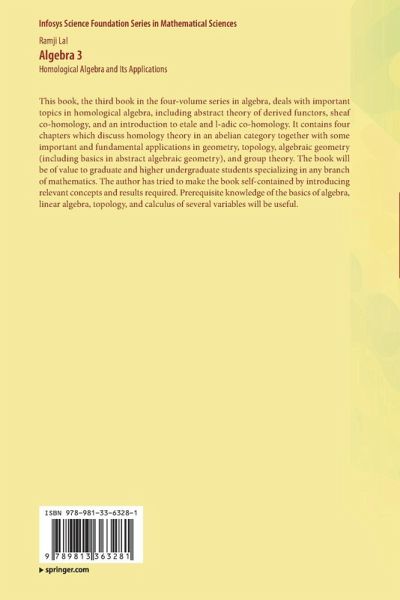 This book, the third book in the four-volume series in algebra, deals with important topics in homological algebra, including abstract theory of derived functors, sheaf co-homology, and an introduction to etale and l-adic co-homology. It contains four chapters which discuss homology theory in an abelian category together with some important and fundamental applications in geometry, topology, algebraic geometry (including basics in abstract algebraic geometry), and group theory. The book will be of value to graduate and higher undergraduate students specializing in any branch of mathematics. The author has tried to make the book self-contained by introducing relevant concepts and results required. Prerequisite knowledge of the basics of algebra, linear algebra, topology, and calculus of several variables will be useful.