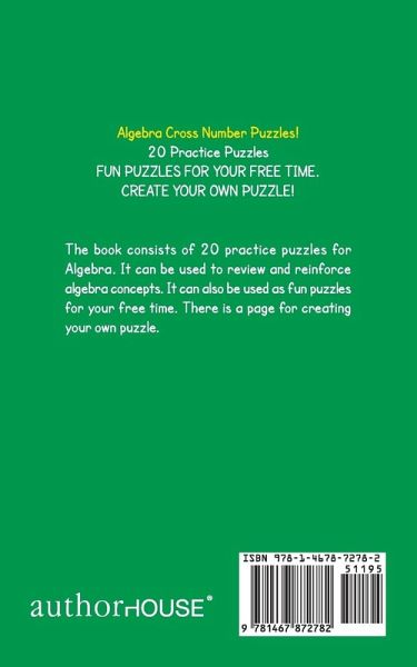 Algebra Cross Number Puzzles! 20 Practice Puzzles FUN PUZZLES FOR YOUR FREE TIME. CREATE YOUR OWN PUZZLE! The book consists of 20 practice puzzles for Algebra. It can be used to review and reinforce algebra concepts. It can also be used as fun puzzles for your free time. There is a page for creating your own puzzle.
