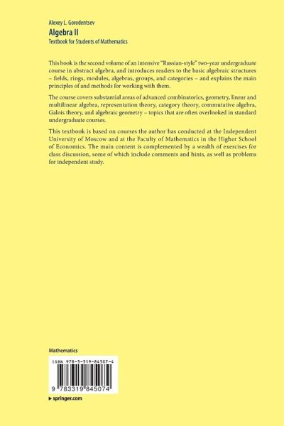 This book is the second volume of an intensive "Russian-style" two-year undergraduate course in abstract algebra, and introduces readers to the basic algebraic structures - fields, rings, modules, algebras, groups, and categories - and explains the main principles of and methods for working with them.