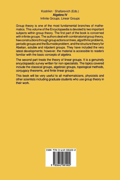 Group theory is one of the most fundamental branches ofmathematics. This volume of the Encyclopaedia is devoted totwo important subjects within group theory. The first partof the book is concerned with infinite groups. The authorsdeal with combinatorial group theory, free constructionsthrough group actions on trees, algorithmic problems,periodic groups and the Burnside problem, and the structuretheory for Abelian, soluble and nilpotent groups. They haveincluded the very latest developments; however, the materialis accessible to readers familiar with the basic concepts ofalgebra.The second part treats the theory of linear groups. It is agenuinely encyclopaedic survey written for non-specialists.The topics covered includethe classical groups, algebraicgroups, topological methods, conjugacy theorems, and finitelinear groups.This book will be very useful to allmathematicians,physicists and other scientists including graduate studentswho use group theory in their work.