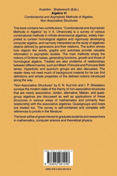 This book contains two contributions: "Combinatorial and Asymptotic Methods in Algebra" by V.A. Ufnarovskij is a survey of various combinatorial methods in infinite-dimensional algebras, widely interpreted to contain homological algebra and vigorously developing computer algebra, and narrowly interpreted as the study of algebraic objects defined by generators and their relations. The author shows how objects like words, graphs and automata provide valuable information in asymptotic studies. The main methods emply the notions of Gröbner bases, generating functions, growth and those of homological algebra. Treated are also problems of relationships between different series, such as Hilbert, Poincare and Poincare-Betti series. Hyperbolic and quantum groups are also discussed. The reader does not need much of background material for he can find definitions and simple properties of the defined notions introduced along the way. "Non-Associative Structures" by E.N.Kuz'min and I.P.Shestakov surveys the modern state of the theory of non-associative structures that are nearly associative. Jordan, alternative, Malcev, and quasigroup algebras are discussed as well as applications of these structures in various areas of mathematics and primarily their relationship with the associative algebras. Quasigroups and loops are treated too. The survey is self-contained and complete with references to proofs in the literature. The book will be of great interest to graduate students and researchers in mathematics, computer science and theoretical physics.