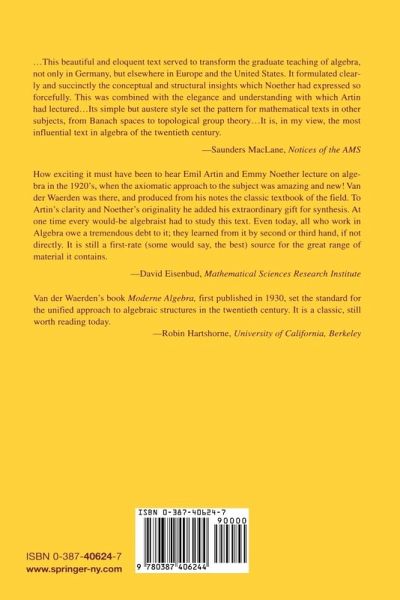 ...This beautiful and eloquent text served to transform the graduate teaching of algebra, not only in Germany, but elsewhere in Europe and the United States. It formulated clearly and succinctly the conceptual and structural insights which Noether had expressed so forcefully. This was combined with the elegance and understanding with which Artin had lectured...Its simple but austere style set the pattern for mathematical texts in other subjects, from Banach spaces to topological group theory...It is, in my view, the most influential text in algebra of the twentieth century.