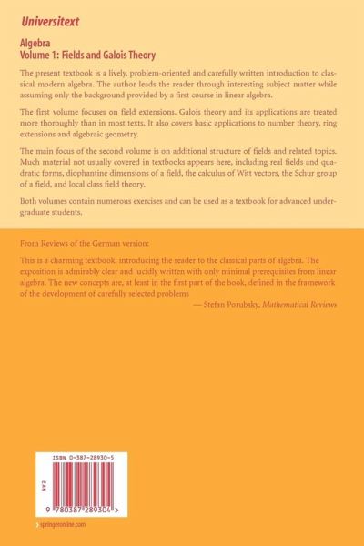 This translation of the 1987 German edition is an introduction into the classical parts of algebra with a focus on fields and Galois theory. It discusses nonstandard topics, such as the transcendence of pi, and new concepts are defined in the framework of the development of carefully selected problems. It includes an appendix with exercises and notes on the previous parts of the book, and brief historical comments are scattered throughout.