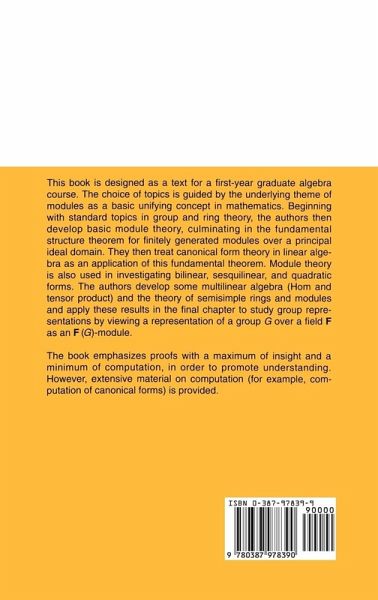 This book is designed as a text for a first-year graduate algebra course. As necessary background we would consider a good undergraduate linear algebra course. An undergraduate abstract algebra course, while helpful, is not necessary (and so an adventurous undergraduate might learn some algebra from this book). Perhaps the principal distinguishing feature of this book is its point of view. Many textbooks tend to be encyclopedic. We have tried to write one that is thematic, with a consistent point of view. The theme, as indicated by our title, is that of modules (though our intention has not been to write a textbook purely on module theory). We begin with some group and ring theory, to set the stage, and then, in the heart of the book, develop module theory. Having developed it, we present some of its applications: canonical forms for linear transformations, bilinear forms, and group representations. Why modules? The answer is that they are a basic unifying concept in mathematics.The reader is probably already familiar with the basic role that vector spaces play in mathematics, and modules are a generaliza tion of vector spaces. (To be precise, modules are to rings as vector spaces are to fields.