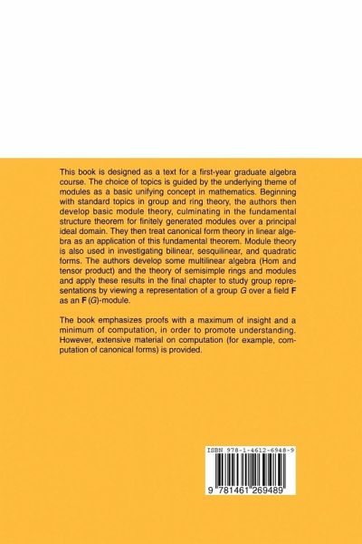 This book is designed as a text for a first-year graduate algebra course. As necessary background we would consider a good undergraduate linear algebra course. An undergraduate abstract algebra course, while helpful, is not necessary (and so an adventurous undergraduate might learn some algebra from this book). Perhaps the principal distinguishing feature of this book is its point of view. Many textbooks tend to be encyclopedic. We have tried to write one that is thematic, with a consistent point of view. The theme, as indicated by our title, is that of modules (though our intention has not been to write a textbook purely on module theory). We begin with some group and ring theory, to set the stage, and then, in the heart of the book, develop module theory. Having developed it, we present some of its applications: canonical forms for linear transformations, bilinear forms, and group representations. Why modules? The answer is that they are a basic unifying concept in mathematics.The reader is probably already familiar with the basic role that vector spaces play in mathematics, and modules are a generaliza tion of vector spaces. (To be precise, modules are to rings as vector spaces are to fields.