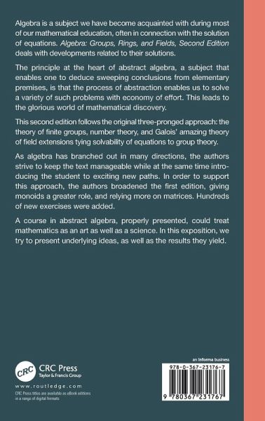 This second edition follows the original three-pronged approach: the theory of finite groups, number theory, and Galois' amazing theory of field extensions tying solvability of equations to group theory.