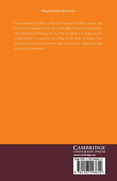 First published in 1930, as the third edition of a 1907 original, this book forms number six in the Cambridge Tracts in Mathematics and Mathematical Physics Series. The text gives a concise account of the theory of equations according to the ideas of Galois. This book will be of value to anyone with an interest in algebra and the history of mathematics.