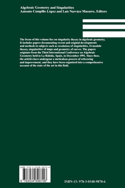 The volume contains both general and research papers. Among the first ones are papers showing recent and original developments or methods in subjects such as resolution of singularities, D-module theory, singularities of maps and geometry of curves. The research papers deal on topics related to, or close to, those listed_above. The contributions are organized in three parts according to their contents. Part I presents a set of papers on resolution of singularities, a topic of renewed activity. It deals with important topics of current interest, such as canonical, algorithmic, combinatorial and graphical procedures (Villamayor, Oka, Marijmin), as well as special results on desingularization in characteristic p (Cossart, Moh), and connections between resolution and structure of the space of arcs through a singularity (Gonz81ez-Sprinberg-Lejeune-Jalabert). Part II contains a series of papers on the study~of singularities and its connections with differential systems and deformation or perturbation theo ries. Two expository papers (Maisonobe-Briam;on, :'vlebkhout) describe, in an algebro-geometric way, the interaction between singularities and D-module t.he ory including recent progress on Bernstein polynomials and Newton polygon techniques. Geometry of foliations (Henaut, Garcfa-Reguera), polar varieties and stratifications (Hajto) are also topics treated here. Two other papers (Wall, Greuel-Pfister) deal with quasihomogeneous singularities in the contexts of per turbations and moduli spaces. Globalization of deformations of singularities (de Jong) and determination of complex topology from the real one (~10nd) com plete this series of papers. Part III consists of papers on algebraic geometry of curves and surfaces.