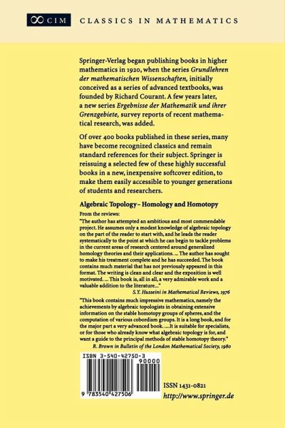 "In the more than twenty five years since its first appearance, the book has met with favorable response, both in its use as a text and as reference. It is a good course which leads the reader systematically to the point at which he can begin to tackle problems in algebraic topology. ... This book remains one of the best sources for the material which every young algebraic topologist should know." (Corina Mohorianu, Zentralblatt MATH, Vol. 1003 (3), 2003)