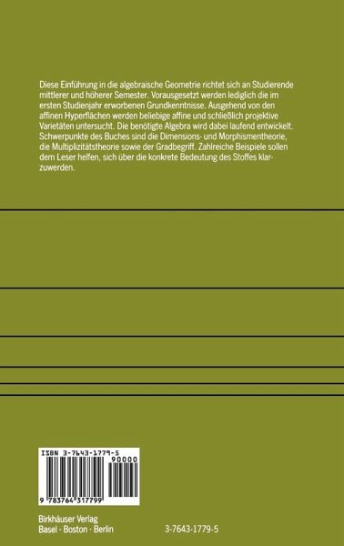 Diese Einführung in die algebraische Geometrie richtet sich an Studierende mittlere und höhere Semester. Vorausgesetzt werden lediglich die im ersten Studienjahr erworbenen Grundkenntnisse. Ausgehend von den affinen Hyperflächen werden beliebige affine und schliesslich projektive Varietäten untersucht. Die benötigte Algebra wird dabei laufend entwickelt. Schwerpunkte des Buches sind die Dimensions- und Morphismentheorie, die Multiplizitätstheorie sowie der Gradbegriff. Zahlreiche Beispiele sollen dem Leser helfen, sich über die konkrete Bedeutung des Stoffes klarzuwerden.
