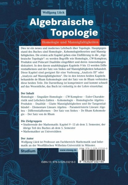 Dies ist ein neues und modernes Lehrbuch über Topologie. Hauptgegenstand des Buches sind Homologie-, Kohomologietheorien und Mannigfaltigkeiten. Die ersten acht Kapitel geben eine Einführung in die "Algebraische Topologie": es werden Begriffe wie Homologie, CW-Komplexe, Produkte und Poincare Dualitäte eingeführt und deren Anwendungen diskutiert. In den davon unabhängigen Kapiteln 9 bis 13 werden Differentialformen und der Satz von Stokes auf Mannigfaltigkeiten behandelt. Diese Kapitel sind geeignet für eine Vorlesung "Analysis III" oder "Analysis auf Mannigfaltigkeiten". Die in den letzten beiden Kapiteln behandelte de Rham Kohomologie und der Satz von de Rham verbinden diese beiden Teile. Die Darstellung ist komprimiert und kommt schnell auf das Wesentliche, das Buch ist vielseitig in der Lehre einsetzbar.