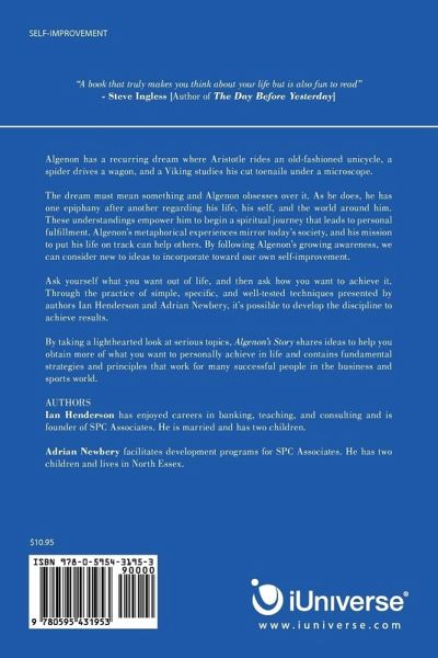 Algenon keeps having the same dream, over and over. In it, Aristotle rides an old-fashioned unicycle, a spider is driving a wagon and a Viking is studying his cut toenails under a microscope. The dream must mean something, and Algenon obsesses over it. As he does, he has one epiphany after another regarding his life, himself and the world around him. These understandings empower him and allow for a spiritual journey that leads to personal fulfillment. Algenon's experiences are similar to many men, and his mission to put his life on track can help others from all backgrounds. The steps he takes to live a better life are available to everyone. It's time to ask yourself what you want out of life. Then, ask how you want to achieve it. Through the practice of a few, simple techniques, it's possible to develop the discipline to achieve results that you never thought possible. Learn profound life lessons and take a lighthearted look at serious subjects in Algenon's Story: The Journey to Personal Excellence and Empowerment.
