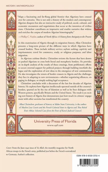 "Maps a fascinating and far-flung global frontier that Algerians have crossed over for centuries. This is not only a history of the modern and contemporary Algerian diaspora but also an instructive study of political, social, cultural, and economic encounters and negotiations that occur at the interstices of civilizations. Christelow contributes an impressive and erudite narrative that widens and enriches the corpus of modern Algerian historiography."--Phillip C. Naylor, author of North Africa: A History from Antiquity to the Present This account of Algeria through its migratory history begins in the last quarter of the eighteenth century by looking at forced migration through the slave trade. It moves through the colonial era and continues into Algeria's turbulent postcolonial experience. In Algerians without Borders, Allan Christelow examines the factors that have drawn or pushed Algerians to cross borders, both literal and metaphoric. He provides an in-depth analysis of the results of these crossings: from problematic efforts to secure external support for political projects, to building interfaith dialogue and the exploration of new ideas, to the emergence of new communities. He also investigates the return of border crossers to Algeria and the challenges they face in adapting to new environments, whether negotiating alliances, engaging in dialogue, or simply seeking legal acceptance. Christelow concludes with a discussion of the last few decades of Algerian history. He explores how Algerian intellectuals operated outside of the country's borders, spurred on by the rise of Islamism as well as by freer dialogues with Western powers, specifically Britain and the United States. The result is an alternate history of Algeria that demonstrates just how much its citizens' engagement with other societies has transformed the country. Allan Christelow, professor of history at Idaho State University, is the author of Muslim Law Courts and the French Colonial State in Algeria and Thus Ruled Emir Abbas.