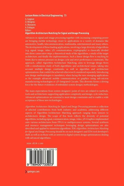 Algorithm-Architecture Matching for Signal and Image Processing presents a collection of selected contributions from both industry and academia, addressing different aspects of Algorithm-Architecture Matching approach ranging from sensors to architectures design. The scope of this book reflects the diversity of potential algorithms, includingsignal, communication, image, video, 3D-Graphics implemented onto various architectures from FPGA to multiprocessor systems. Several synthesis and resource management techniques leveraging design optimizations are also described and applied to numerous algorithms.