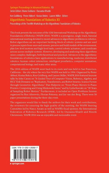 This book presents the outcomes of the 12th International Workshop on the Algorithmic Foundations of Robotics (WAFR 2016). WAFR is a prestigious, single-track, biennial international meeting devoted to recent advances in algorithmic problems in robotics. Robot algorithms are an important building block of robotic systems and are used to process inputs from users and sensors, perceive and build models of the environment, plan low-level motions and high-level tasks, control robotic actuators, and coordinate actions across multiple systems. However, developing and analyzing these algorithms raises complex challenges, both theoretical and practical. Advances in the algorithmic foundations of robotics have applications to manufacturing, medicine, distributed robotics, human-robot interaction, intelligent prosthetics, computer animation, computational biology, and many other areas.