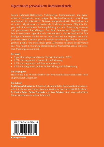 Soziale Netzwerk-Plattformen, Videoportale, Suchmaschinen und personalisierte Nachrichten-Apps prägen die Nachrichtenmenüs vieler Bürger zunehmend. Sie präsentieren Nutzern maßgeschneiderte Nachrichten, die sie mittels Algorithmen an persönliche Vorlieben anpassen. Mögliche Folgen sind eine veränderte Meinungsbildung und die Entstehung extremer und polarisierter Einstellungen. Der Band beantwortet folgende Fragen: Wie funktionieren algorithmisch personalisierte Nachrichtenkanäle? Wie häufig und intensiv werden sie von den Deutschen im Vergleich mit nicht-personalisierten Kanälen genutzt? Welche soziodemografischen, psychologischen, politik- und medienbezogenen Merkmale zeichnen Intensivnutzer aus? Wie hängt die Nutzung algorithmischer Nachrichtenkanäle mit extremen Meinungen zusammen?