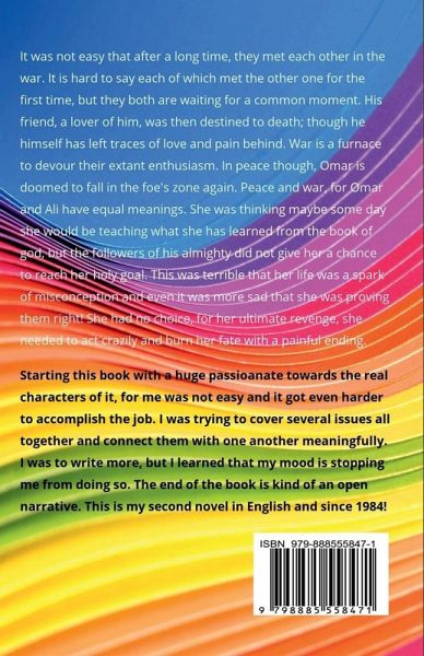 It was not easy that after a long time, they met each other in the war. It is hard to say each of which met the other one for the first time, but they both are waiting for a common moment. His friend, a lover of him, was then destined to death; though he himself has left traces of love and pain behind. War is a furnace to devour their extant enthusiasm. In peace though, Omar is doomed to fall in the foe's zone again. Peace and war, for Omar and Ali have equal meanings. She was thinking maybe some day she would be teaching what she has learned from the book of god, but the followers of his almighty did not give her a chance to reach her holy goal. This was terrible that her life was a spark of misconception and even it was more sad that she was proving them right! She had no choice, for her ultimate revenge, she needed to act crazily and burn her fate with a painful ending. Beyond bullets and within a karmic situation, Omar tried to ease his memory by reminding himself the good memories which he had with her, but his intellect could not be fooled that easily, it demanded truth and justice both of which were rare. Thus, radically he choses to find a solution, the way which he could not pass through unless that head of bastards was killed. It was a deal which no one else could do but himself and in this, he could not ask anyone to help him. He was all alone with himself again.