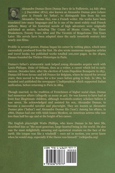 Alexandre Dumas (born Dumas Davy de la Pailleterie, 24 July 1802 - 5 December 1870), also known as Alexandre Dumas père (where père is French for 'father', to distinguish him from his son Alexandre Dumas fils), was a French writer. His works have been translated into many languages and he is one of the most widely read French authors. Many of his historical novels of high adventure were originally published as serials, including The Count of Monte Cristo, The Three Musketeers, Twenty Years After and The Vicomte of Bragelonne: Ten Years Later. His novels have been adapted since the early twentieth century into nearly 200 films. Prolific in several genres, Dumas began his career by writing plays, which were successfully produced from the first. He also wrote numerous magazine articles and travel books; his published works totalled 100,000 pages. In the 1840s, Dumas founded the Théâtre Historique in Paris. Dumas's father's aristocratic rank helped young Alexandre acquire work with Louis-Philippe, Duke of Orléans, then as a writer, a career which led to early success. Decades later, after the election of Louis-Napoléon Bonaparte in 1851, Dumas fell from favour and left France for Belgium, where he stayed for several years, then moved to Russia for a few years before going to Italy. In 1861, he founded and published the newspaper L'Indépendent, which supported Italian unification, before returning to Paris in 1864. Though married, in the tradition of Frenchmen of higher social class, Dumas had numerous affairs (allegedly as many as 40). He was known to have had at least four illegitimate children, although twentieth-century scholars believe it was seven. He acknowledged and assisted his son, Alexandre Dumas, to become a successful novelist and playwright. They are known as Alexandre Dumas père ('father') and Alexandre Dumas fils ('son'). Among his affairs, in 1866, Dumas had one with Adah Isaacs Menken, an American actress who was less than half his age and at the height of her career. The English playwright Watts Phillips, who knew Dumas in his later life, described him as "the most generous, large-hearted being in the world. He also was the most delightfully amusing and egotistical creature on the face of the earth. His tongue was like a windmill - once set in motion, you never knew when he would stop, especially if the theme was himself." (wikipedia.org)