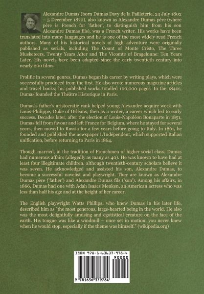Alexandre Dumas (born Dumas Davy de la Pailleterie, 24 July 1802 - 5 December 1870), also known as Alexandre Dumas père (where père is French for 'father', to distinguish him from his son Alexandre Dumas fils), was a French writer. His works have been translated into many languages and he is one of the most widely read French authors. Many of his historical novels of high adventure were originally published as serials, including The Count of Monte Cristo, The Three Musketeers, Twenty Years After and The Vicomte of Bragelonne: Ten Years Later. His novels have been adapted since the early twentieth century into nearly 200 films. Prolific in several genres, Dumas began his career by writing plays, which were successfully produced from the first. He also wrote numerous magazine articles and travel books; his published works totalled 100,000 pages. In the 1840s, Dumas founded the Théâtre Historique in Paris. Dumas's father's aristocratic rank helped young Alexandre acquire work with Louis-Philippe, Duke of Orléans, then as a writer, a career which led to early success. Decades later, after the election of Louis-Napoléon Bonaparte in 1851, Dumas fell from favour and left France for Belgium, where he stayed for several years, then moved to Russia for a few years before going to Italy. In 1861, he founded and published the newspaper L'Indépendent, which supported Italian unification, before returning to Paris in 1864. Though married, in the tradition of Frenchmen of higher social class, Dumas had numerous affairs (allegedly as many as 40). He was known to have had at least four illegitimate children, although twentieth-century scholars believe it was seven. He acknowledged and assisted his son, Alexandre Dumas, to become a successful novelist and playwright. They are known as Alexandre Dumas père ('father') and Alexandre Dumas fils ('son'). Among his affairs, in 1866, Dumas had one with Adah Isaacs Menken, an American actress who was less than half his age and at the height of her career. The English playwright Watts Phillips, who knew Dumas in his later life, described him as "the most generous, large-hearted being in the world. He also was the most delightfully amusing and egotistical creature on the face of the earth. His tongue was like a windmill - once set in motion, you never knew when he would stop, especially if the theme was himself." (wikipedia.org)